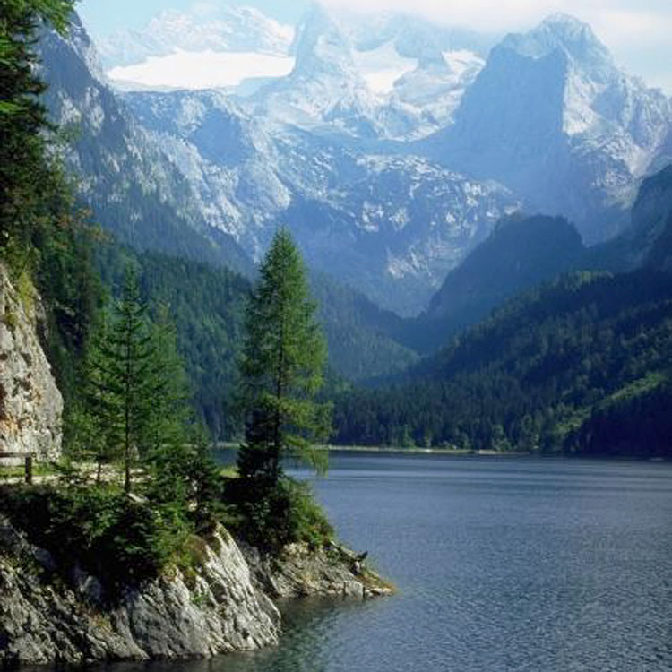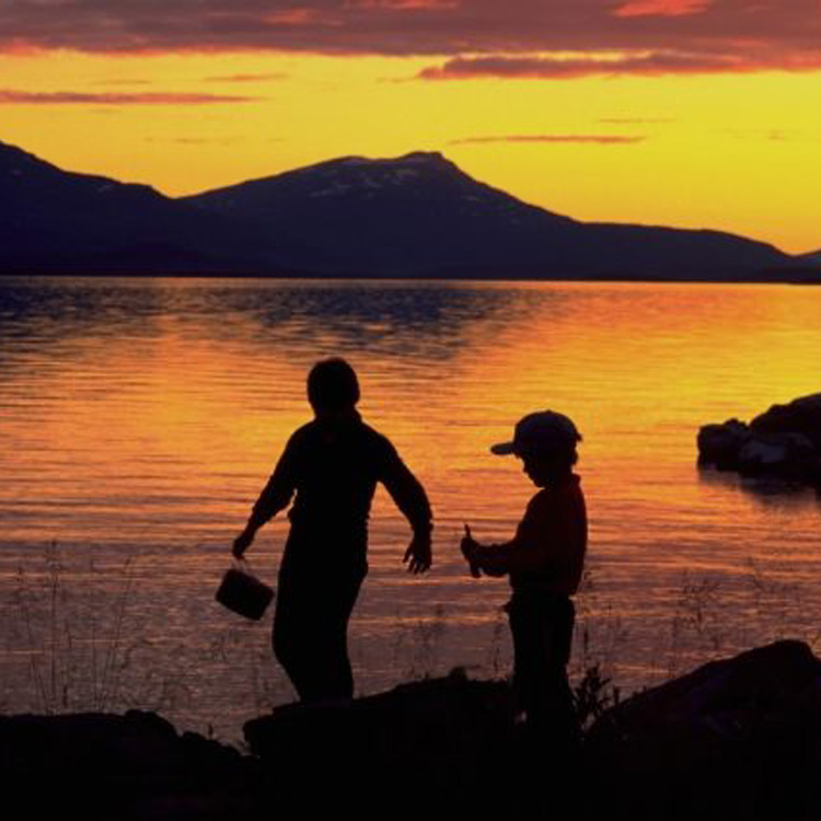 red flowers fish fish lake and mountains