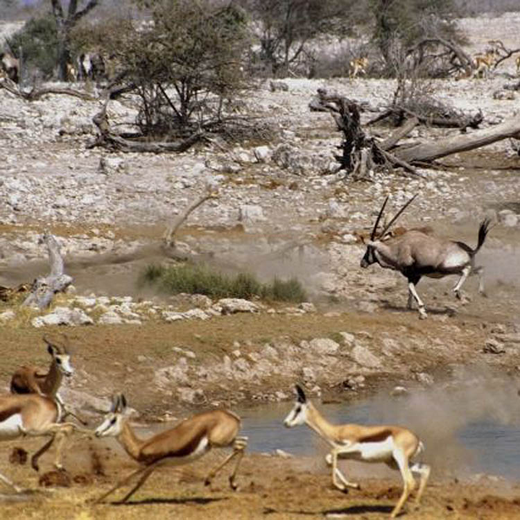 giraffe sipping water lion jackal yak